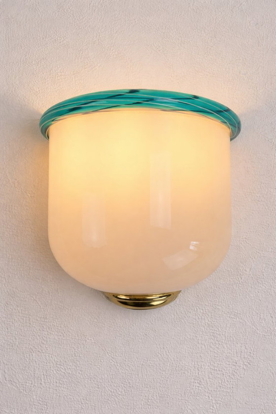 High-quality hand-blown Murano glass wall light with a domed white base topped with a blue rim with white threads.