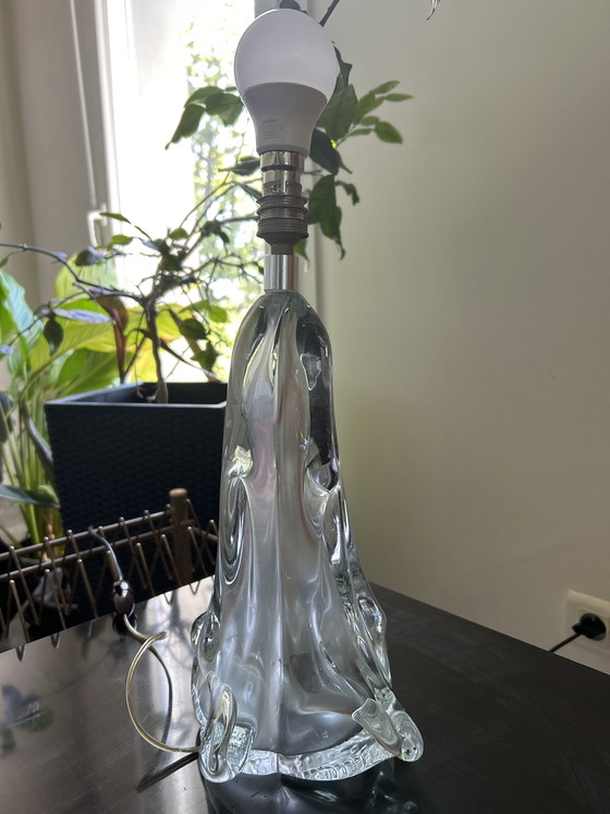 Discover this solid crystal lamp base, a true homage to the Art Deco style of the 1950s. Weighing an impressive 3 to 4 kg, this light fixture is distinguished by its flowing glass effect, evoking the aesthetic of molten magma.