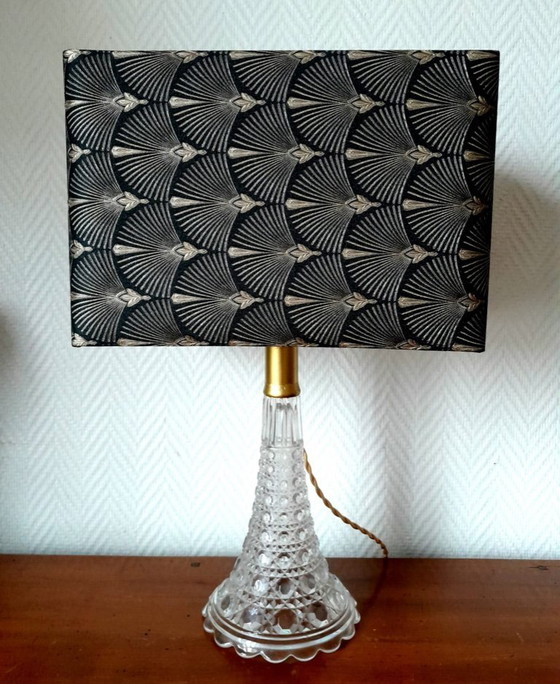 The lamp base is made of molded glass with a conical shape and a raised "diamond" pattern, with a gilt metal socket support (repainted). A custom-made lampshade (30 x 15 x 20 cm) was created for this lamp: rectangular in shape, upholstered in a fabric with a gilt Art Deco palmette design on a black background.