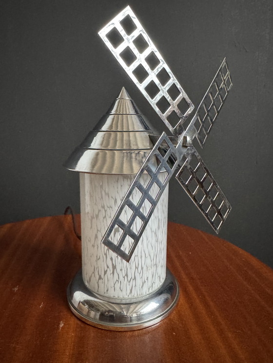 Rare Art Deco style lamp/nightlight (1940s/50s) in the shape of a windmill, made of chromed metal with a cylindrical Clichy glass body and a fixed, openwork chromed metal propeller; very good overall condition (nice patina), for a bayonet bulb.