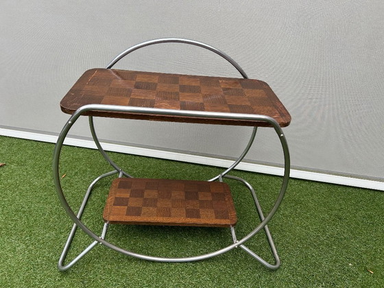 Sleek and graceful at the same time - this particular vintage side table combines an elegant chrome-plated tubular frame with two wooden tops in geometric veneer pattern. The top has a symmetrical inlay that immediately catches the eye. The round lines of the frame give the table an airy feel, while the wood tones add warmth and class. The bottom top makes the table practical: extra space for books, magazines or decoration. Period: 1930s-40s style, Bauhaus/Art Deco influences Material: chromed metal and wood veneer Dimensions: 69 cm wide x 40 cm deep x 63 cm high Condition: vintage, slight signs of use appropriate to its age A real eye-catcher for those who love design with character and history. Perfect as a side table, plant table or showpiece in a modern interior.