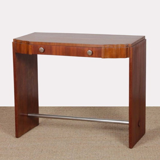 This Art Deco dressing table is a French piece from the 1950s. It features a mahogany frame with clean lines, complemented by a chromed metal crossbar. This piece can also be used as a console or desk. It opens from the front with a drawer in the apron. This table has been restored while retaining its original patina.