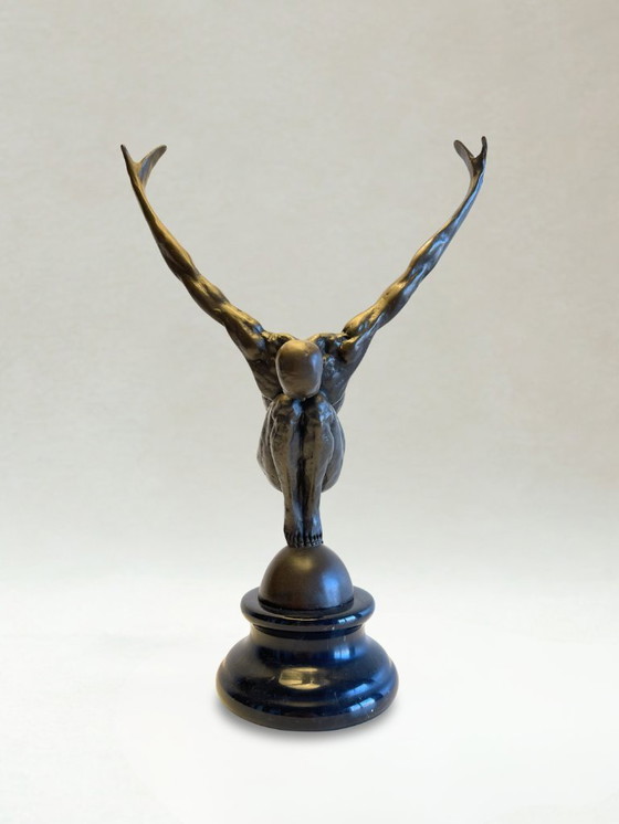 Art Deco style decorative sculpture depicting a nude male figure in a balanced pose, arms raised in a highly graphic and expressive posture.