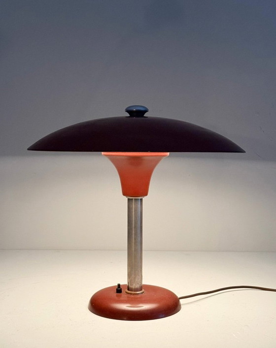 Art Deco table lamp by Max Schumacher, Germany, 1930s, metal construction in dark red, one light socket, Dimensions approx.: H: 42 cm, Ø: 42 cm.