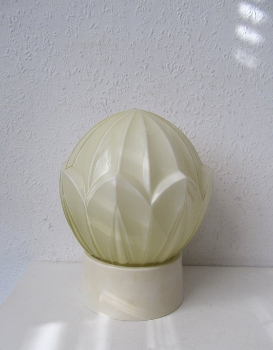 Thabur lamps are known for their sturdy opaline glass shades and often feature soft pastel colors such as mint green, yellow, pink, and cream. The simplicity and elegance of these lamps make them timeless!