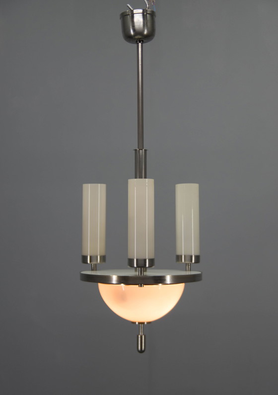 Nickel plated Art Deco chandelier with new bottom opaline blown white glass shade and original marked champagne color tubular shades. Item was cleaned and rewired. Two separate circuits: 3+1x60W, E25-E27 bulbs Ref: MaPr 359 7