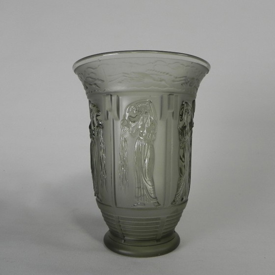 This Art Deco-era model is made of thick-walled, light gray pressed smoked glass.