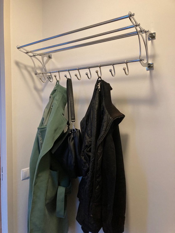 Beautiful original Art Nouveau wall coat rack in chrome-plated brass. 90cm wide. In very good condition considering its age. The coat rack has nine adjustable hooks. Pick-up in Tilburg is preferred.