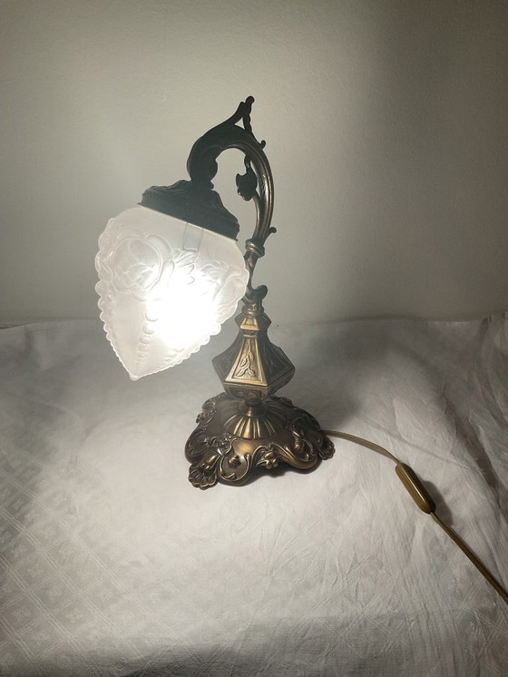 Elegant Spanish Art Nouveau table lamp. Decorated metal base and frame, frosted glass shade with relief. Includes a switch.