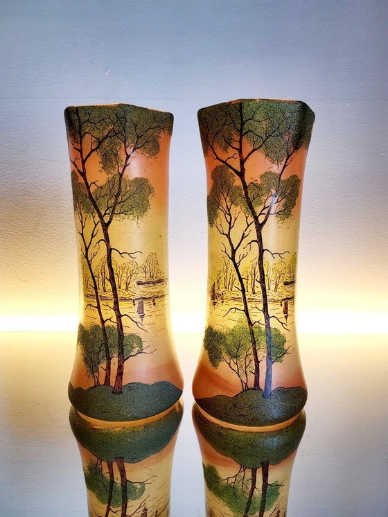 beautiful Art Nouveau hexagonal set of vases decorated with landscape decor enameled.