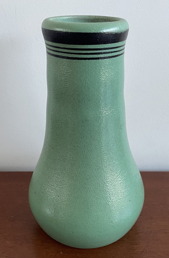 This beautiful Art Deco vase from Kunstaardewerkfabriek Sint Lukas is a real eye-catcher. The 100 model is crafted in an elegant turquoise with contrasting black piping, giving it a timeless look. Perfect for adding a touch of vintage charm to your interior.