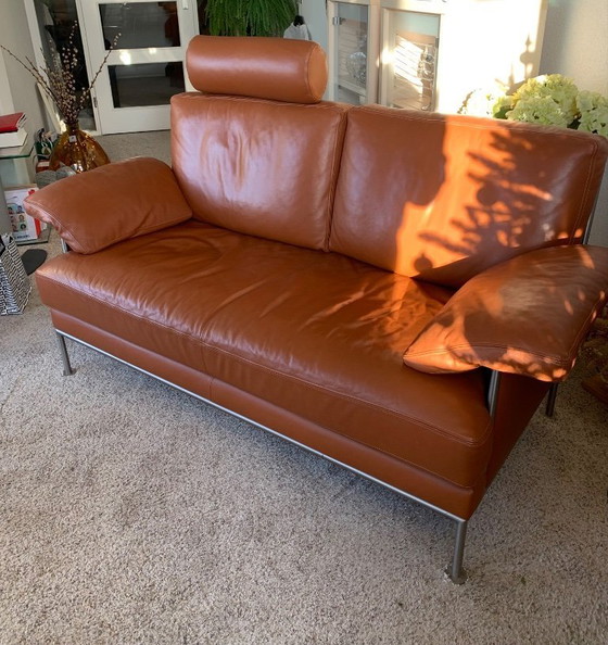 Beautiful designer two-seater sofa from Artanova. Features a movable headrest. Original owner and in a non-smoking environment.