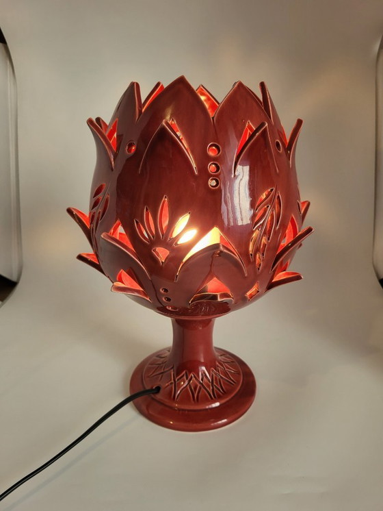 Illuminate your space with this ceramic Artichoke Lamp, a centerpiece of modern design. Its rich burgundy hue and sculptural form evoke contemporary elegance, perfect for enhancing any interior.