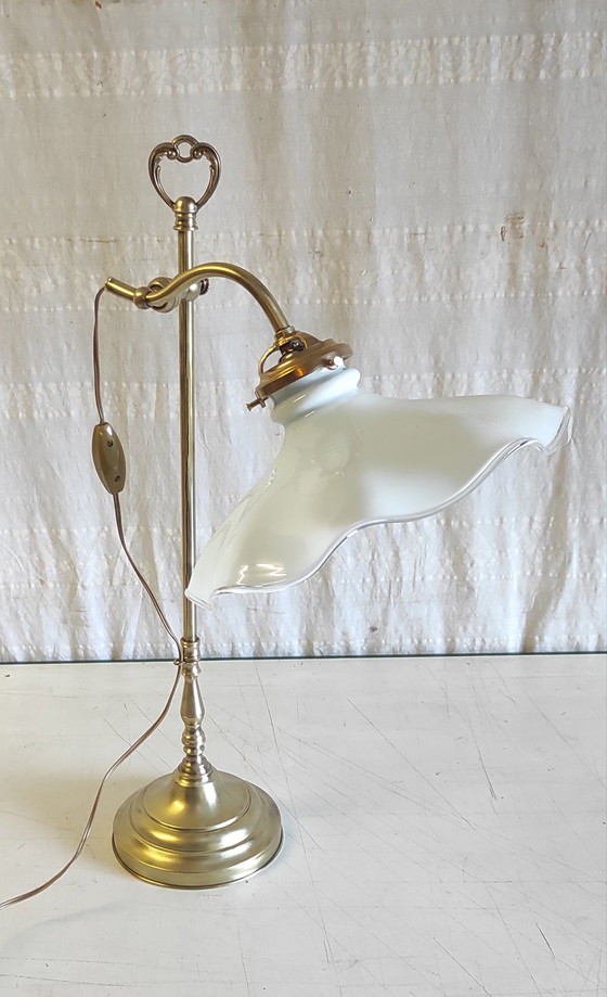 So Déco! Art Nouveau style articulated table lamp in gilded brass with an opaline glass shade. E14 socket. Standard cable with switch and plug.