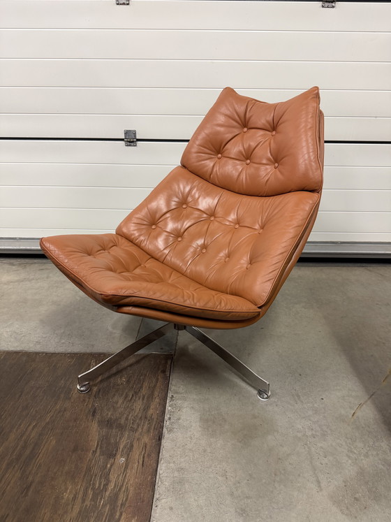Artifort F588 by G. Harcourt In Cognac leather, very beautiful! With a 4-star base (rarer to find!) 360-degree swivel