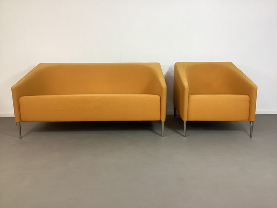 Introducing the Artifort Okergele Diva Bank and Fauteuil, a stunning ensemble that embodies modern elegance and comfort. This set, featuring a vibrant ochre hue, is designed to make a statement in any contemporary living space. The sleek lines and minimalist design reflect Artifort's commitment to quality and style.