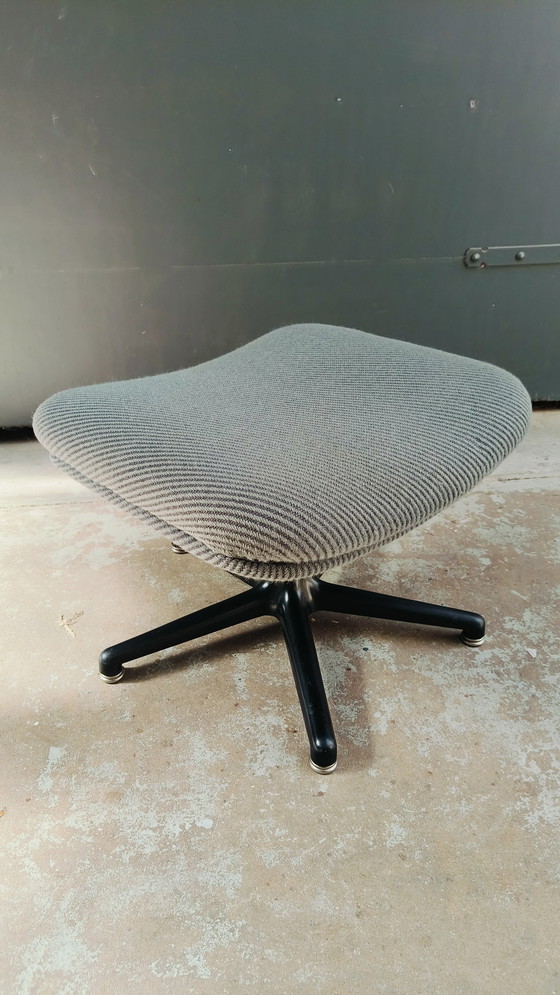 This is a stylish Artifort pouf, perfect for adding a modern touch to your living space. It features a sleek black metal base and a comfortable blue/grey textile top. Ideal for use as a footstool or extra seating, this pouf combines functionality with contemporary design. De poef is in goede staat. Heeft 1 kleine vlek (foto). Ook te combineren met andere Artiforts design klassiekers. Mocht u voor opsturen kiezen gaarne via DPD.