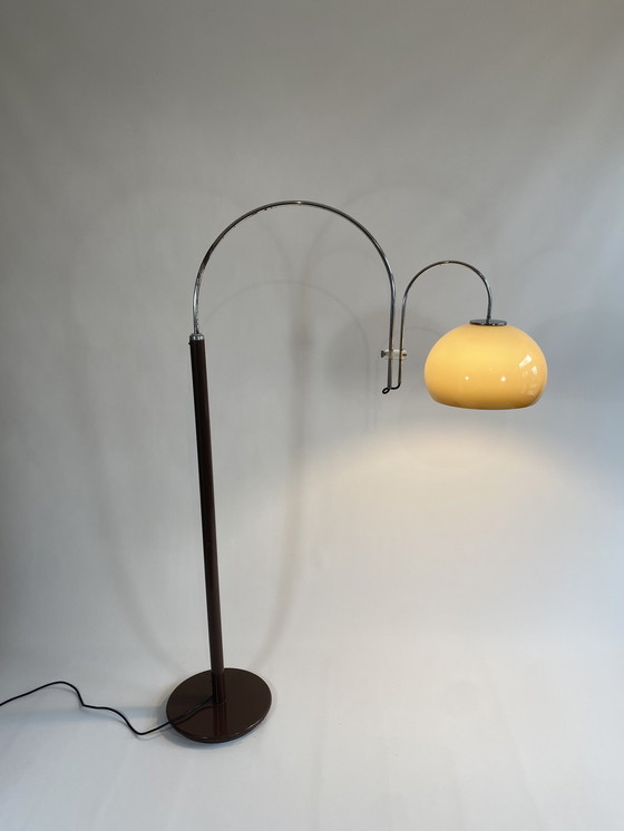 Artiforte Double Arc Floor Lamp, Italy 1970s. The arches allow the mushroom shade to be placed in all directions. The lamp is also adjustable in height by turning the knob on the metal base. Height Adjustable Between 150cm And 200cm.