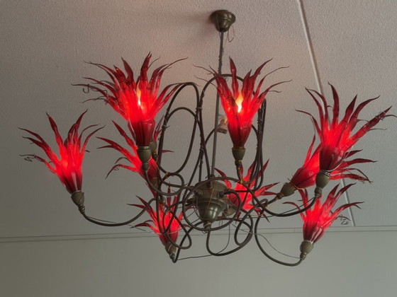Vintage Queens Gallery chandelier, crown type 10, with red calyxes.