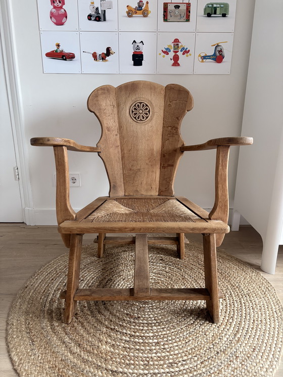 This object is an antique oak monastery chair or knight's chair, likely dating from the first half of the 20th century (circa 1930-1950). These chairs are often associated with the Arts and Crafts style or Dutch Brutalism.