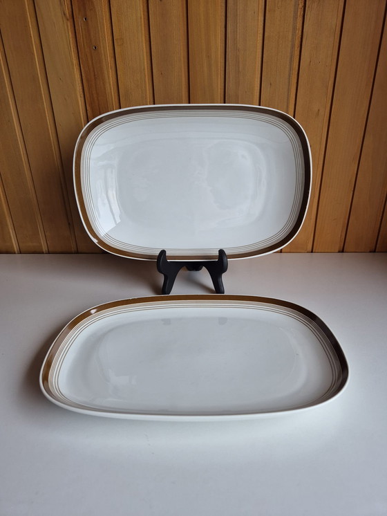 A set of two Arzberg serving bowls, crafted from classic white porcelain with a brown rim and fine lines. These bowls likely belong to the Arzberg Cannelee / Form 1382 range, a timeless Bauhaus design by Hermann Gretsch, known for its clean lines and functional design. The set consists of a large bowl measuring 33.5 x 22 x 5 cm and a smaller bowl measuring 32 x 20.5 x 3 cm. Made of high-quality and durable porcelain. In good vintage condition.