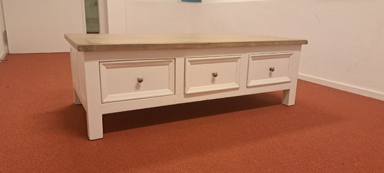 Charming country-style coffee table in white with a solid wood top. The table features three drawers, ideal for storing remote controls, magazines, or other items out of sight.