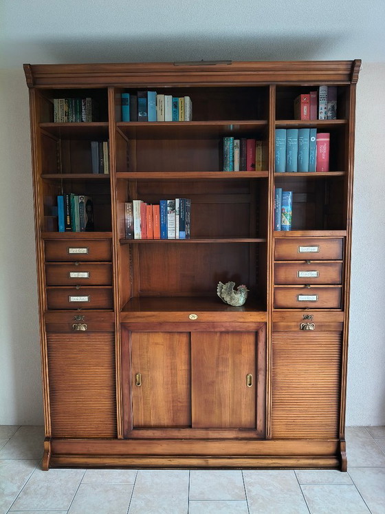 Beautiful, original bookcase by Assi d'Asolo in solid cherry wood. Italian design. Ample storage space, drawers with brass details, tambour doors, and sliding doors. The cabinet is in very good condition. Dimensions: 176 x 227 x 44 (l x h x d).