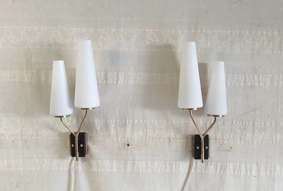 So Déco! Pair of double wall lights in brass and black metal. White opaline glass shades. In the style of designs by Arlus or Lunel.