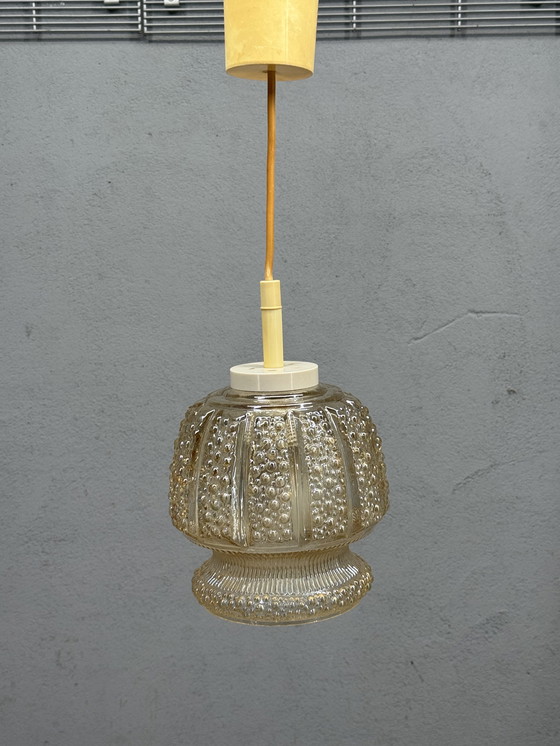 The lamp features a glass shade and a plastic ceiling rose. The design is typical of the 1960s/1970s and exudes that recognizable mid-century atmosphere. The ceiling rose shows slight discoloration and normal signs of wear, consistent with the lamp's age and visible when mounted to the ceiling.