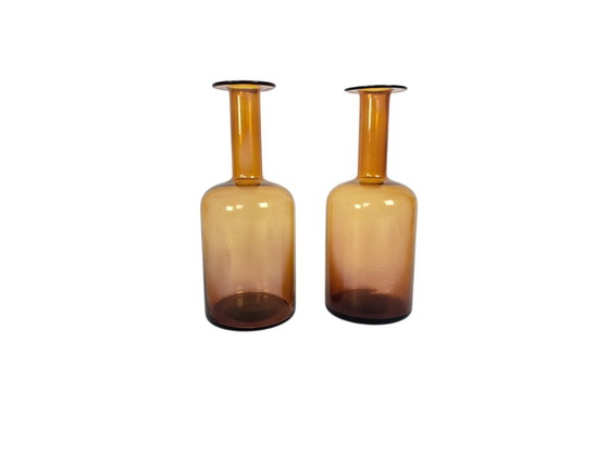 This beautiful set of two "Gulvase" vases, attributed to Kastrup Holmegaard and designed by Otto Brauer, embodies the elegant simplicity of the 1980s. The warm brown hue of the glass adds a touch of refinement to any interior, while the minimalist design provides timeless appeal.