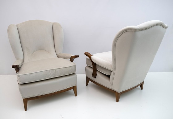 Rare pair of wingback armchairs attributed to Paolo Buffa and produced in the 1950s.