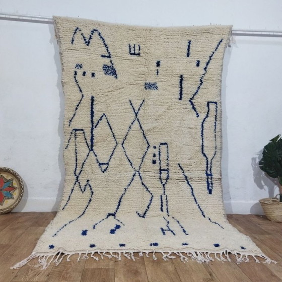 Authentic Moroccan Berber rug made of natural wool, handcrafted in Morocco. This elegant piece features a soft ivory background enhanced by refined blue geometric motifs, creating a unique and artistic composition inspired by traditional Berber design.