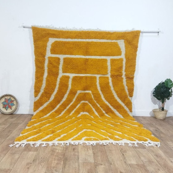 Authentic Moroccan Berber rug made of natural wool, handcrafted in Morocco. This remarkable piece features a bold mustard yellow and ivory design with sculptural geometric lines, creating a strong visual impact while preserving the warmth and authenticity of traditional Berber craftsmanship.