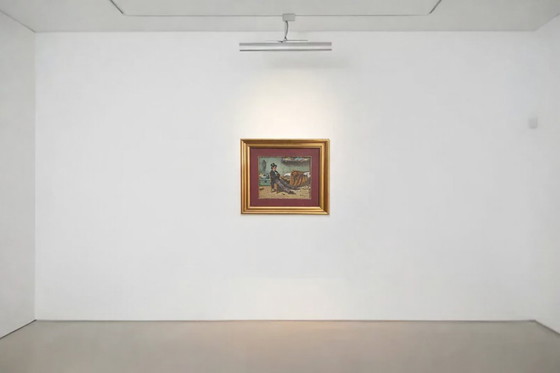 Finishes: Elegant internal mat in burgundy canvas with a loose weave, typical of the craftsmanship of the period, which creates a perfect chromatic contrast with the painting.