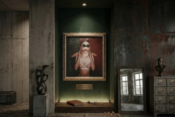 The work depicts a figure draped in a play of bandages and dark lenses, an iconography reminiscent of avant-garde cinema and the psychological atmospheres of noir. It is not a simple image, but a visual experience where the body becomes the canvas and the message becomes profound and magnetic.