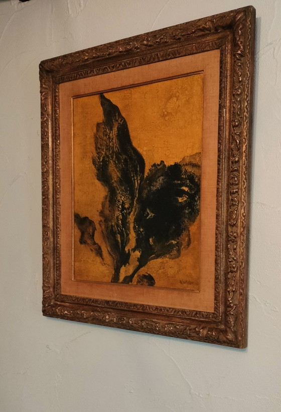 This painting, titled 'Autumn Leaf', offers a captivating abstract composition that captures the beauty of autumn in a unique way. The rich golden background and deep black tones create an intriguing contrast that draws attention and adds a sense of depth and movement to the artwork. The painting is expertly framed in a detailed wooden frame, which further enhances the artistic value and elegance of the piece.