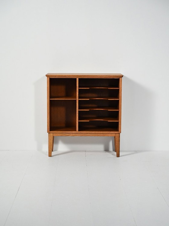 Clean lines and airy proportions embody 1950s Nordic design. The oak frame shows a warm grain; shaped shelves hold magazines and records beside two practical side bays. Slightly splayed legs lighten the silhouette. The original Åvidabergs manufacturer label is still present. Good condition. May show signs of age. Please pay attention to the photographs.