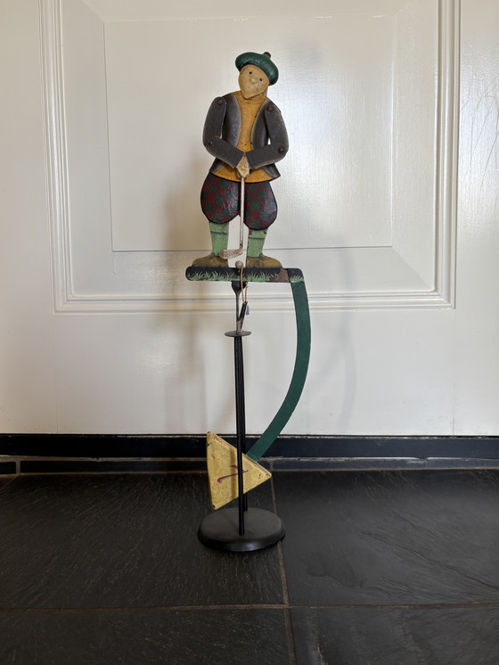 Vintage golfer made from recycled materials and handcrafted. It balances on a pedestal and you can swing it left and right. Hand-painted metal.