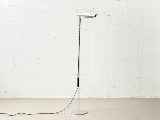 Iconic floor lamp from the HALO series by Baltensweiler, designed by Rico and Rosmarie Baltensweiler in the 1970s. A slender, chrome-plated steel frame with a flat, round base is combined with a cylindrical aluminum lamp head that houses the visible halogen bulb.