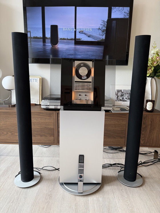A beautiful and perfectly coordinated Bang & Olufsen design set consisting of a BeoSound Ouverture, the original stand with integrated side CD compartments, a pair of BeoLab 6000 active loudspeakers, and a Beo4 remote control.