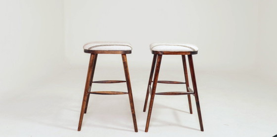 A pair of lightweight, timeless stools in the mid-century modern style, crafted from solid beech wood.