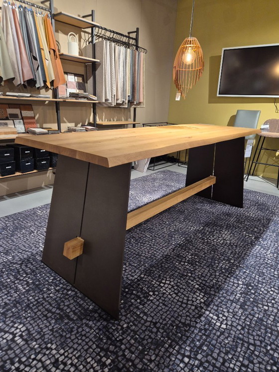 The Amar bar table by Bert Plantagie is a beautiful example of modern design that seamlessly combines functionality and aesthetics. With its generous length of 2.40 meters, this table offers ample space for cozy dinners or informal gatherings in your dining room or kitchen. The tabletop is crafted from high-quality wood, which not only guarantees durability but also provides a warm and inviting appearance. The sturdy metal legs ensure a stable base and add a contemporary look to the ensemble. This table is ideal for lovers of modern interior design looking for a statement piece that is both practical and stylish. Contact us today for more information or to schedule a viewing. Tabletop: Knotty Oak - Oiled Leg: BP 404-Marron