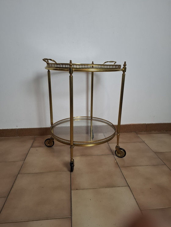 This elegant bar cart is a refined example of vintage design, perfect for adding a touch of class to any space. Crafted with a polished brass frame and a clear glass tray, this piece combines functionality and timeless style.