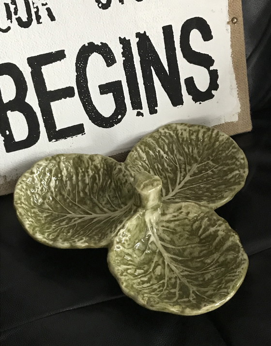 Barbotine presentation dish with vintage cabbage leaves. Made in Portugal. 3 compartments. Excellent condition. 30.5 x 27 cm. Height 9 cm. Shipment by Mondial Relay or Colissimo on request.