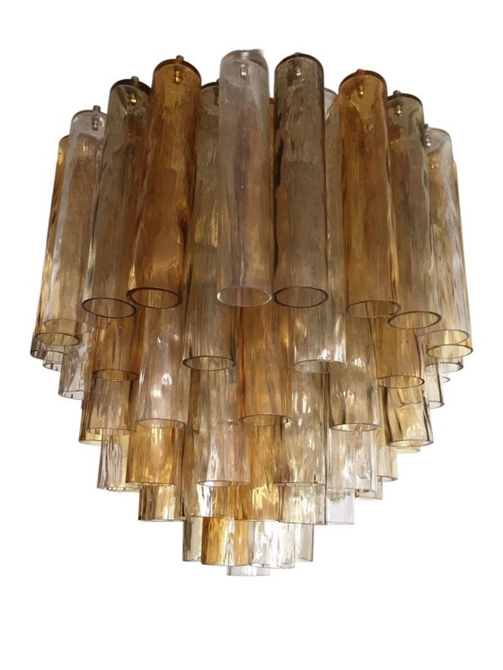 Illuminate your space with the timeless elegance of this Barovier Toso chandelier from the 1970s. This exquisite piece showcases the renowned craftsmanship of Barovier Toso, featuring a cascade of delicate glass tubes in a harmonious blend of gold and transparent hues. The chandelier's vintage charm and sophisticated design make it a perfect centerpiece for any refined interior.