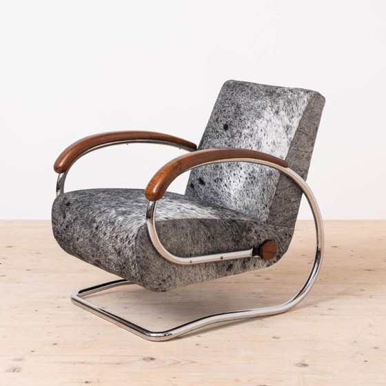 This cantilever chair H221 with a chromed tubular steel frame was designed by Czech designer Jindrich Halabala for the company Uměleckoprůmyslové Závody. This early chair was manufactured in the 1930s. The armchair was professionally restored – the tubular steel frame was newly chromed, the wooden elements were cleaned and refinished with oil, the armchair was reupholstered with hair-on-hide leather in salt and pepper colors. Absolutely rare and stunning piece in beautiful condition, ready for everyday use! Dimensions: H 79cm W 65cm D 85cm Seat height: 42cm