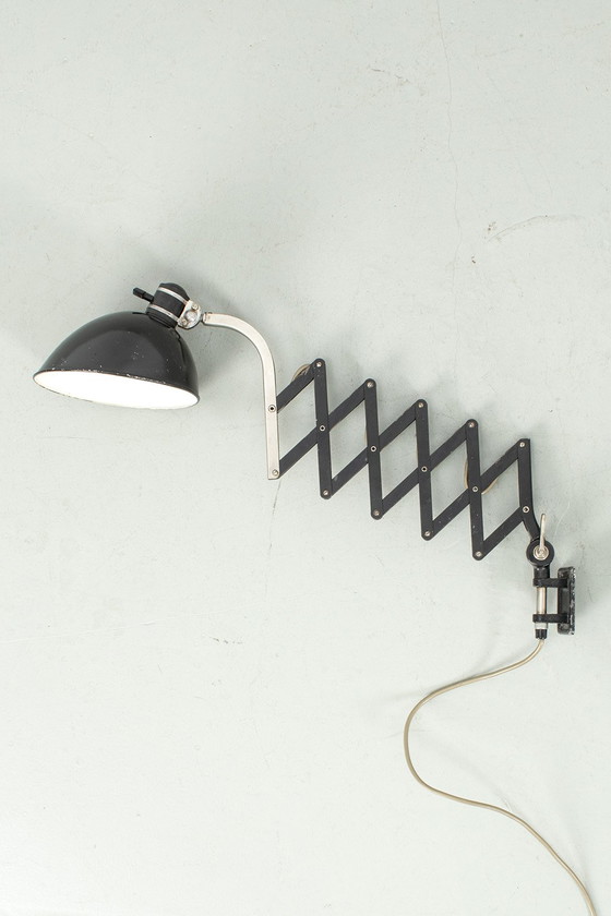 Bauhaus "scissor" lamp. This lamp has a beautiful patina and still works perfectly. The scissor system allows you to easily extend the lamp while keeping it stable. In good vintage condition.