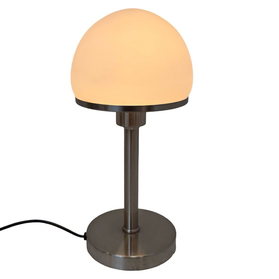 Bauhaus style table lamp with an opaline top. Attributed to Wagenfeld/Tecnolumen but as this piece has no markings we can not say for sure anything about it’s authenticity. Only minor usermarks.