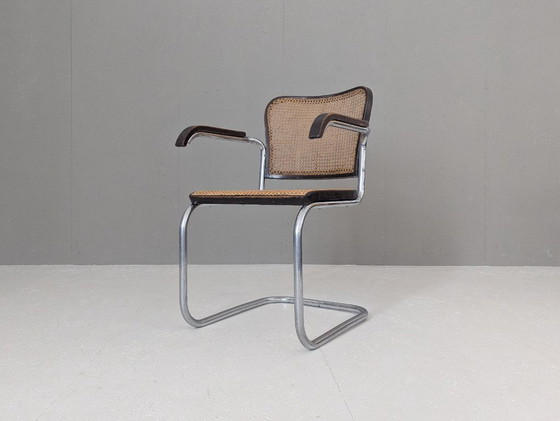 Rooted in Bauhaus ideals but reimagined through a Czechoslovak functionalist lens, the chair maintains the elegant cantilevered structure in chrome-plated tubular steel, while introducing subtle differences: a single vertical steel brace reinforces the curved caned backrest, giving it a distinctive architectural character. The bentwood armrests and frame edges retain a darker finish, contrasting beautifully with the newly handwoven natural cane seat and back.