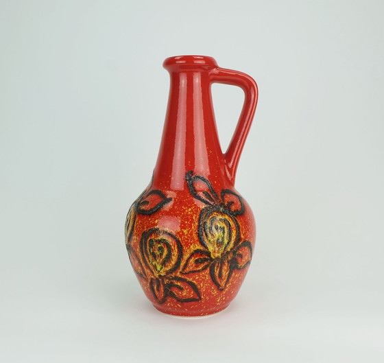 A fantastic vintage West German vase made by Bay Keramik in the 1960's to early 1970's. Intense red and yellow shiny glaze combined with black fat lava leaf pattern. Model number 67 30.